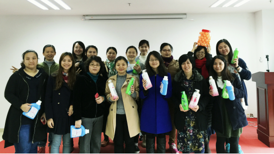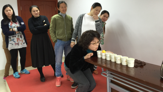 再看保齡球那里,剛開始大家低估了難度,開始玩的時候才發現要擊中目標并不容易,好幾位“女神”直接與目標“擦肩而過”,那是捶胸頓足?。∨抨犠铋L的莫不是吹兵乓球那里,大家憋足一口氣小心翼翼地把兵乓球從第一個水杯吹到第七個水杯,由于只有一次機會,中途球掉落在水杯外面即作廢,需重新排隊,大家充分發揮不屈不撓的毅力,終于成功贏取小禮品。